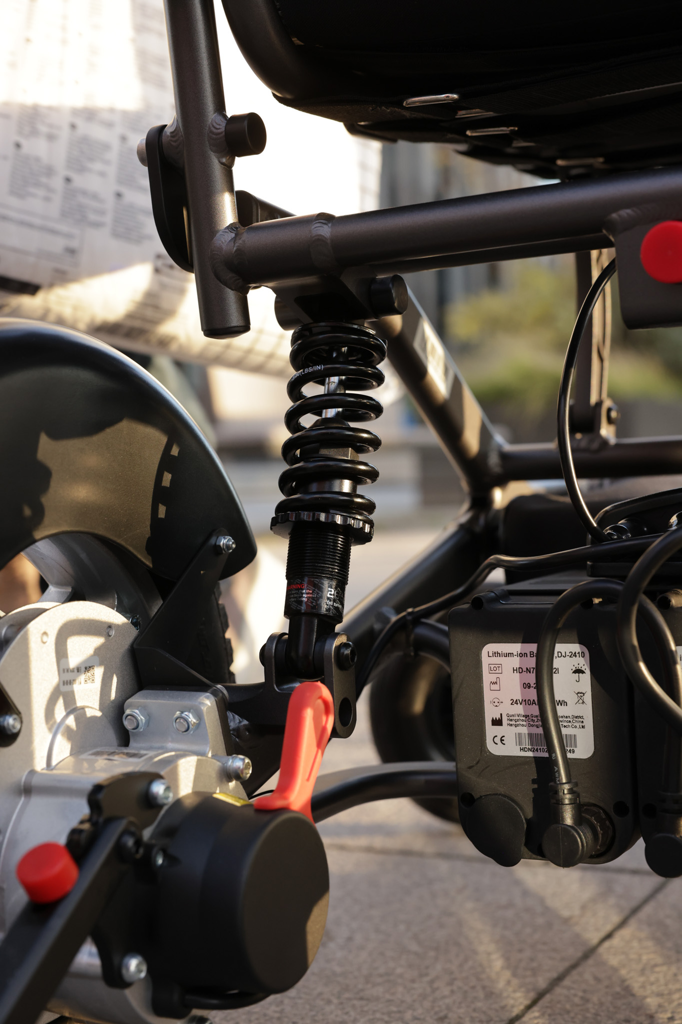 Med fjädring på alla fyra hjul och effektiv dämpning på bakhjulen, ger denna stol en jämn och bekväm åktur. Åkkomforten förbättras ytterligare av den specialdesignade, styva och stabila chassistrukturen.