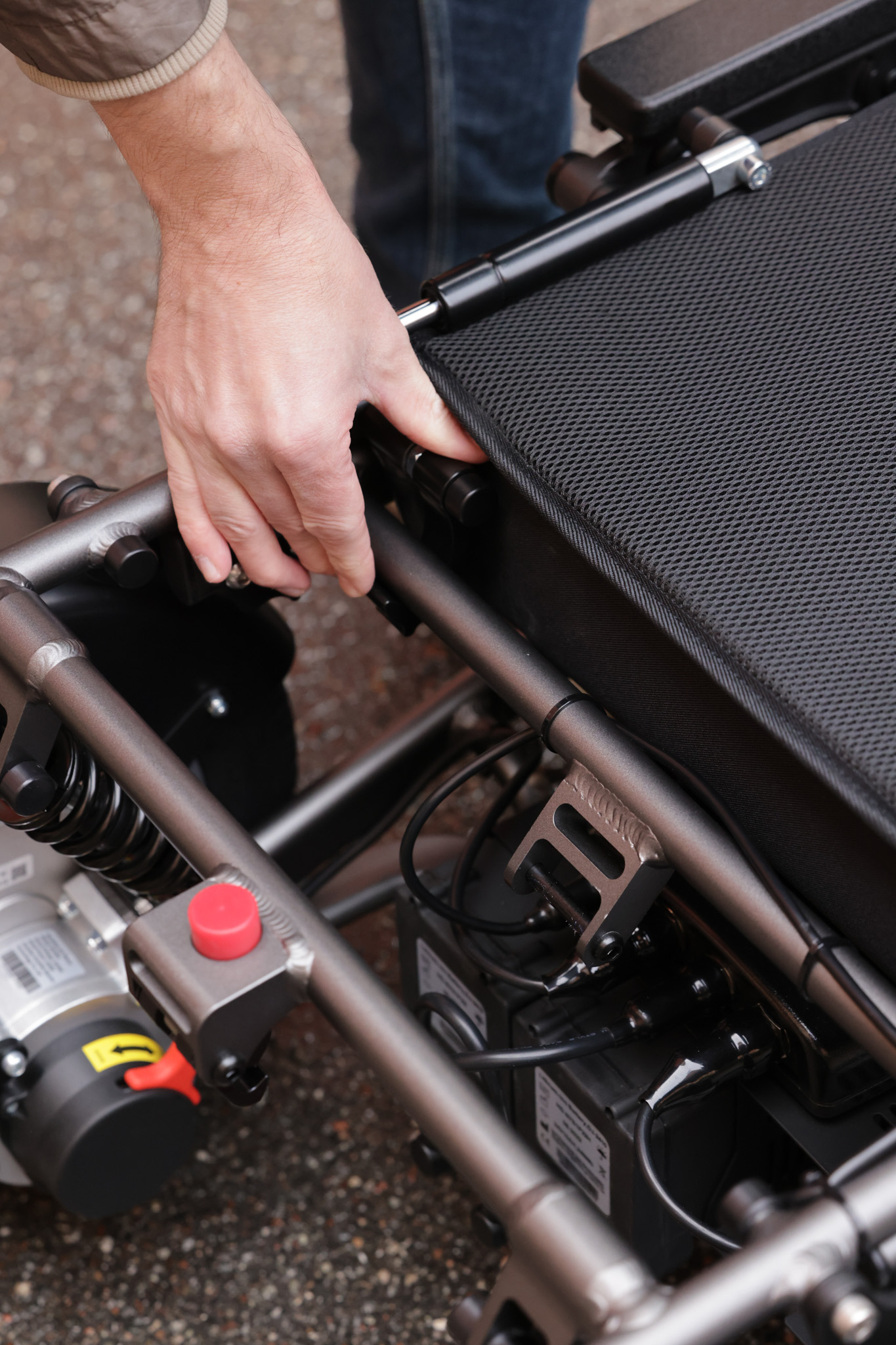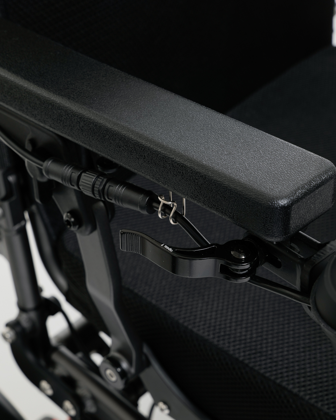 Justerbara armstöd och fotstöd möjliggör en mer skräddarsydd passform och förstärker modellens fokus på komfort. Med tre batterifack erbjuder denna modell utökad användning för längre resor. När den är hopfälld håller ett praktiskt säkerhetslås rullstolen låst i hopfälld position för enkel transport och förvaring.