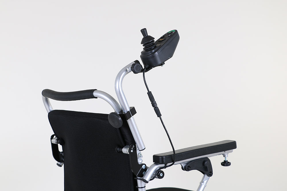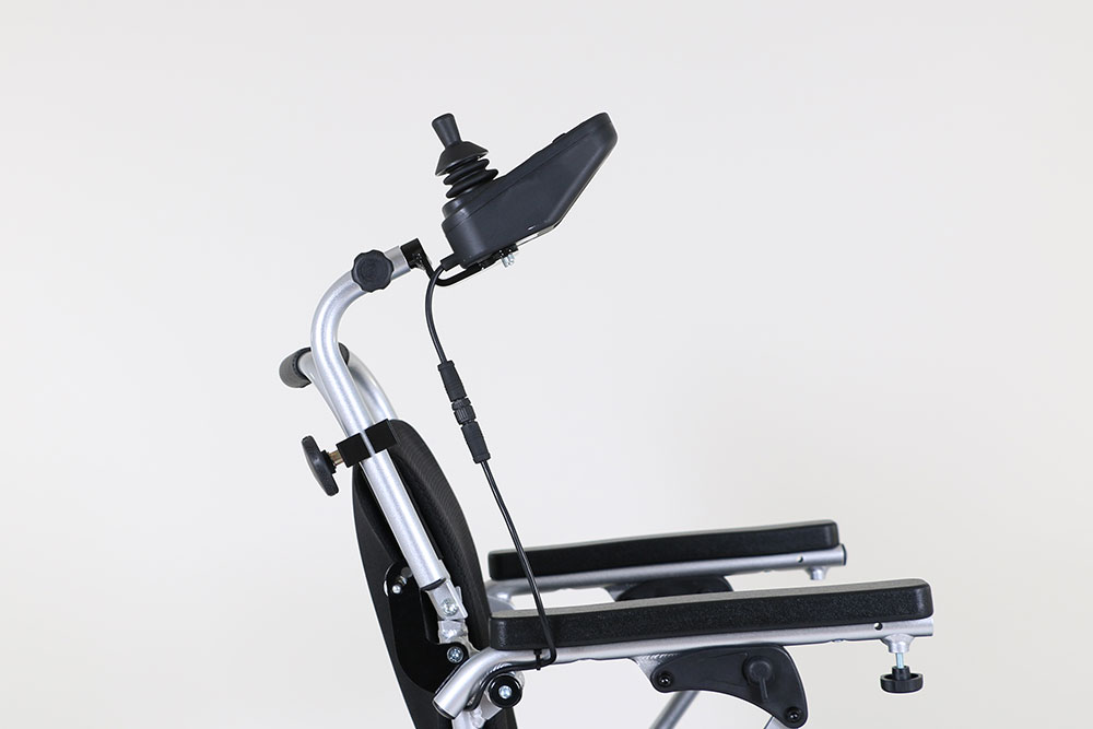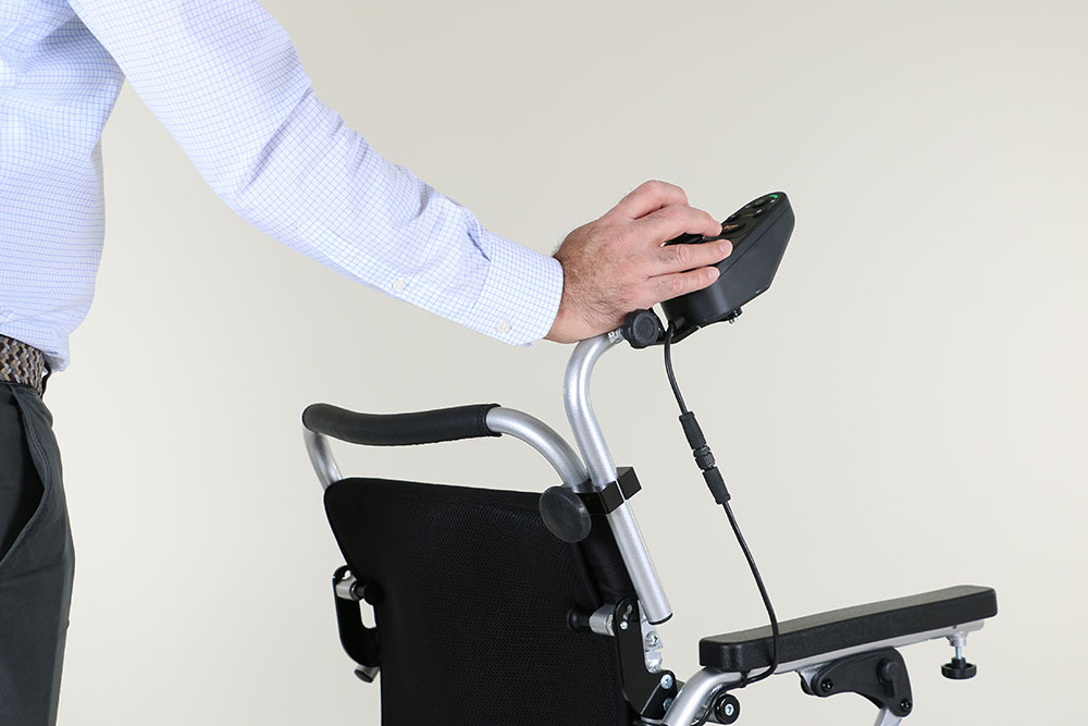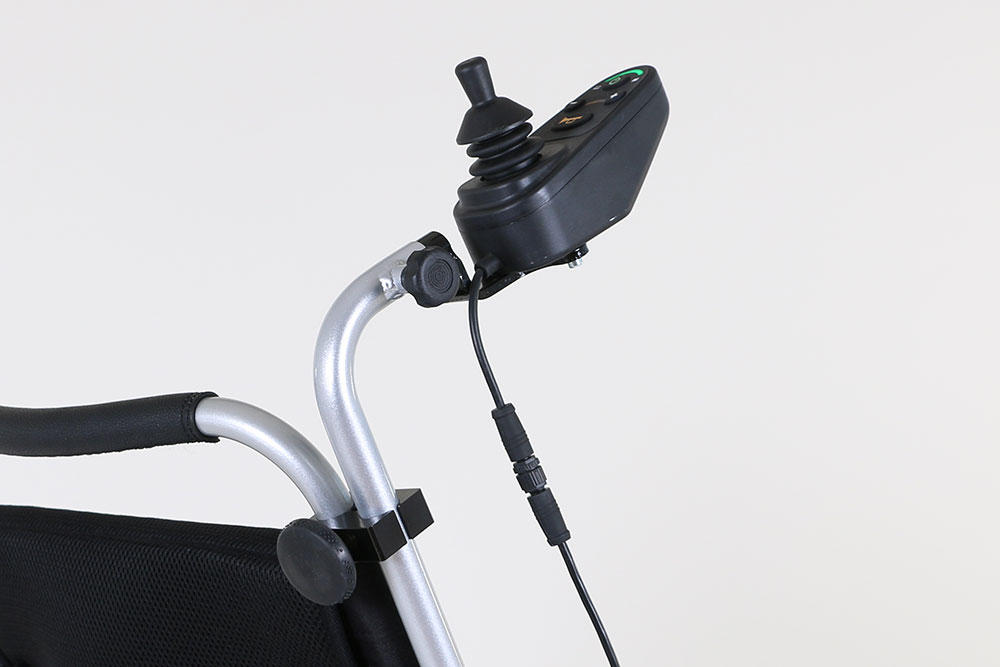 Vårdarstyrningen är ett tillbehör i form av en arm och ett fäste. Detta monterar du enkelt på din Eloflex på några sekunder. När vårdarstyrningen är på plats kan du sedan välja om du vill ha joysticken på armstödet som vanligt eller om du vill montera den på vårdarstyrningen så att den som går bredvid kan köra stolen. Du flyttar enkelt joysticken på några sekunder mellan de olika infästningarna.